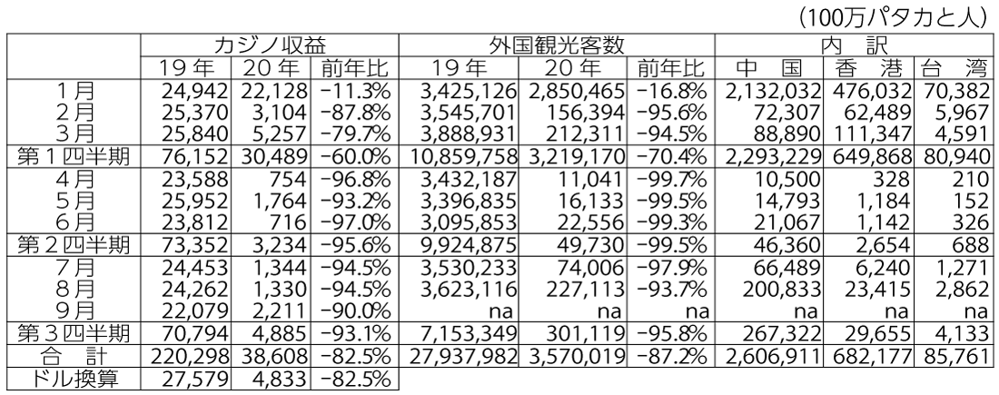 新型コロナ感染で世界のカジノ市場は壊滅的打撃を受けています。世界最大のカジノ市場マカオでは、2月中旬の閉鎖を経ての再開後も前年比95%前後のカジノ収益減が続いています(表1)。深刻なのは、感染防止対策で外国人観光客の入国禁止が継続されているとはいえ、中国本土(広東省)、香港、台湾からの観光客も2週間隔離が解除された7月中旬以降もほとんど増大せず、9月でもカジノ収益90%減の状態だということです。ラスベガスサンズによればマカオ市場の中国客の約4割を広東省が占めていますが、規制緩和の効果がほとんどなく、第3四半期も93%減と壊滅状態が続く結果となっています。