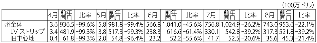 米国では新型コロナ感染が深刻化した今年3月半ばからカジノ閉鎖が始まり、4月には全米989あるカジノ施設が全閉鎖となりました。その後の感染防止対策を施してのカジノ再開時期は州やカジノごとで異なりますが、6月4日から営業再開を行ったネバダ州ではカジノ収益がほぼゼロであった4月、5月からのV字回復が期待されましたが、ラスベガス・ストリップでは前年比4割減の回復で頭打ち状態となっています(表2)。