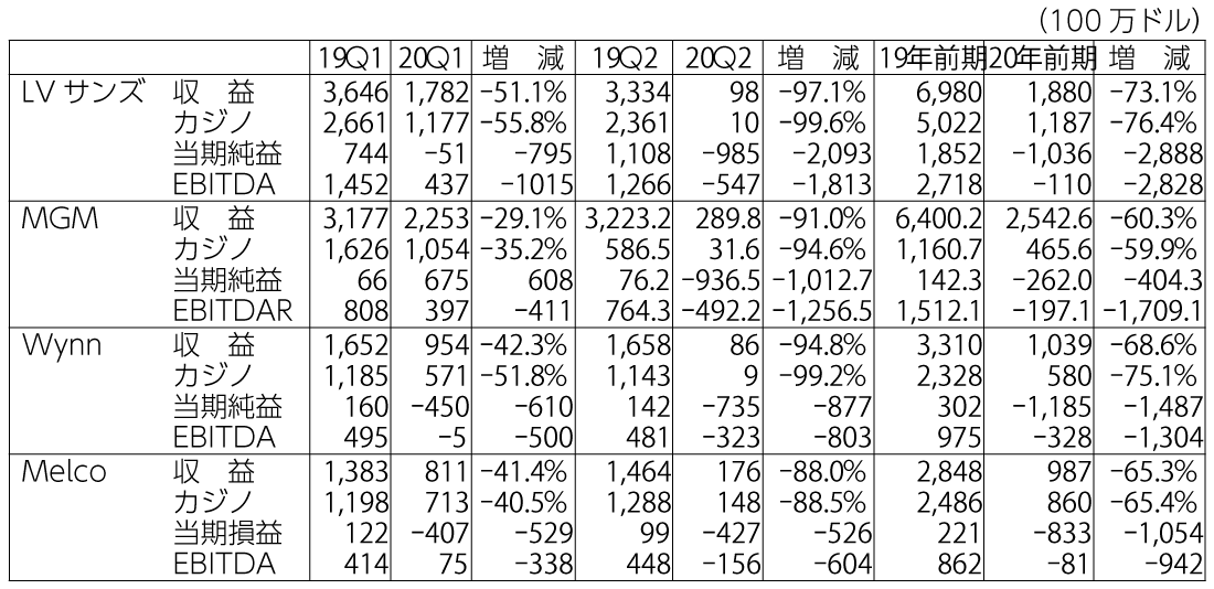 注:MGMは20年前半期でREIT取引で14億9200万ドルの「経費減」の処理がされているが、これが無ければ当期純益はマイナス17億5400万ドルとなる。