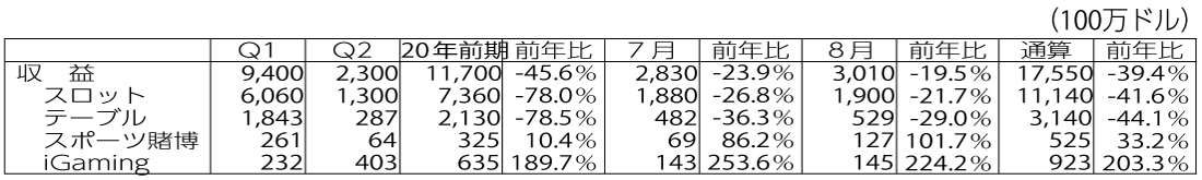 実際、カジノ再開後のネバダ州での回復やラスベガスサンズやMGMなどの収益回復状況は低調です。6月4日から営業再開が行われたラスベガスのカジノ収益は6月の61・4%減から回復途上にありますが、7月と8月は4割減で横ばいとなっています。各カジノ企業のスロット数削減とテーブル当たり収益の落ち込みが顕著であり、「フル稼働」状態になったとしてもカジノの収益力が大きく落ちざるを得ないことを裏付けています。