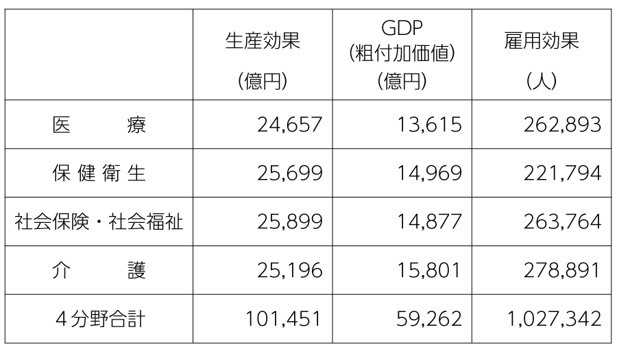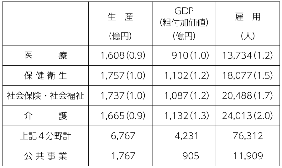 公共事業との比較でみた場合、生産は0・9~1・0とほぼ同じですが、GDP効果は1・0~1・3倍と医療等の経済波及効果が大きく、雇用効果では1・2~2・0倍とさらに大きくなります。