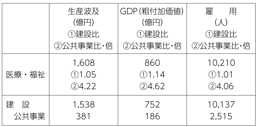 建設では、いずれも医療・福祉が上回り、公共事業との比較では、4・2倍、4・6倍、4・1倍と4倍以上の効果となります。