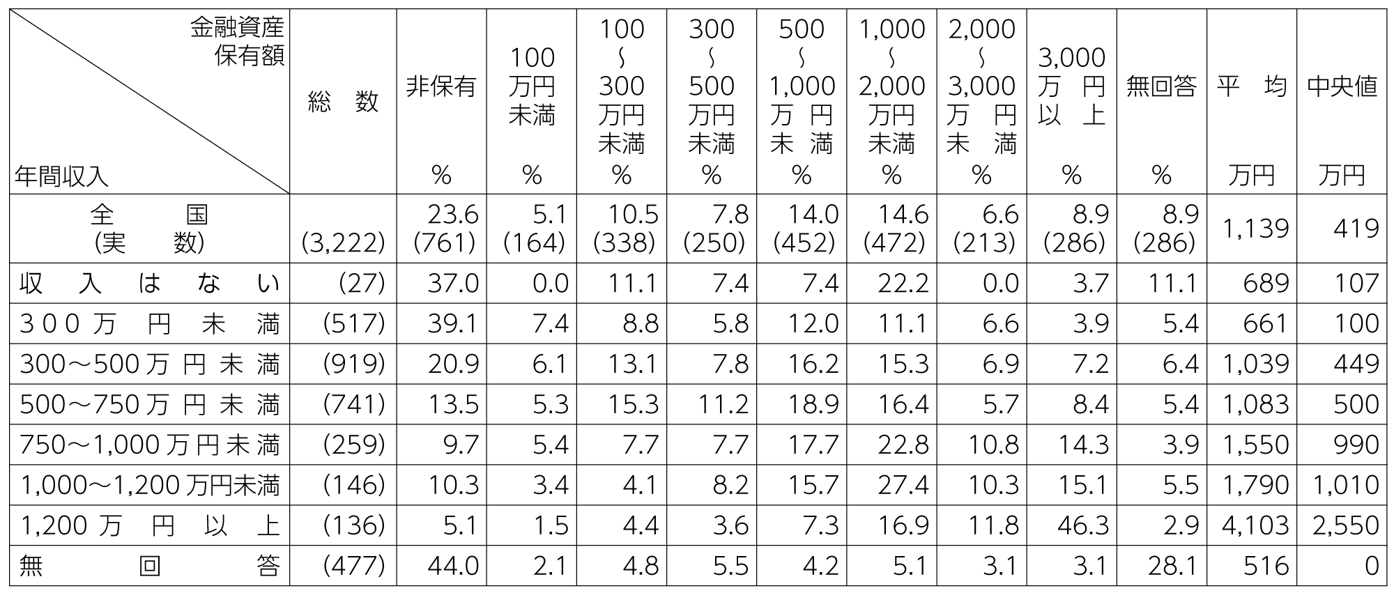 表1は金融広報中央委員会「家計の金融行動に関する世論調査」(2019年版、2人以上の世帯)に収録された世帯の年間収入別に見た金融資産保有額の分布(百分比)です。これを見ると、年間収入300万円未満の世帯ではその55・3%が300万円未満の金融資産しか保有せず、3000万円以上の金融資産を保有する世帯は3・9%に過ぎません。つまり、少ない所得(フロー)と少ない貯蓄(ストック)が表裏一体になっています。