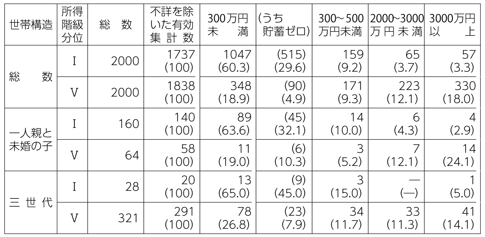 しかし、所得階級第Ⅴ分位では違った状況になっています。18%が3000万円以上の貯蓄を保有する一方、28・2%の世帯は貯蓄500万円未満となっています。つまり、所得階級最上位の世帯の中でも、貯蓄の面では大きな開きがあることがわかります。この点は、世帯構造別に貯蓄額の分布をみると、より明瞭になります。「三世代」世帯では第Ⅴ分位に属する世帯でも約27%が貯蓄300万円未満で、3000万円以上の貯蓄を持っている世帯の割合(14・1%)の2倍近くになっています。「一人親と未婚の子」世帯でも、19%が貯蓄300万円未満、24・1%が500万円未満となっています。かなりの収入を得ていても、コロナ禍で休業・休職を余儀なくされると、たちまち貯蓄を使い果たし、困窮に陥る世帯が多いのはこうした貯蓄格差によるものと思われます。