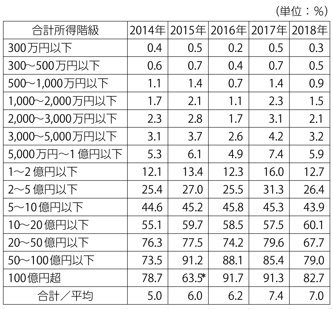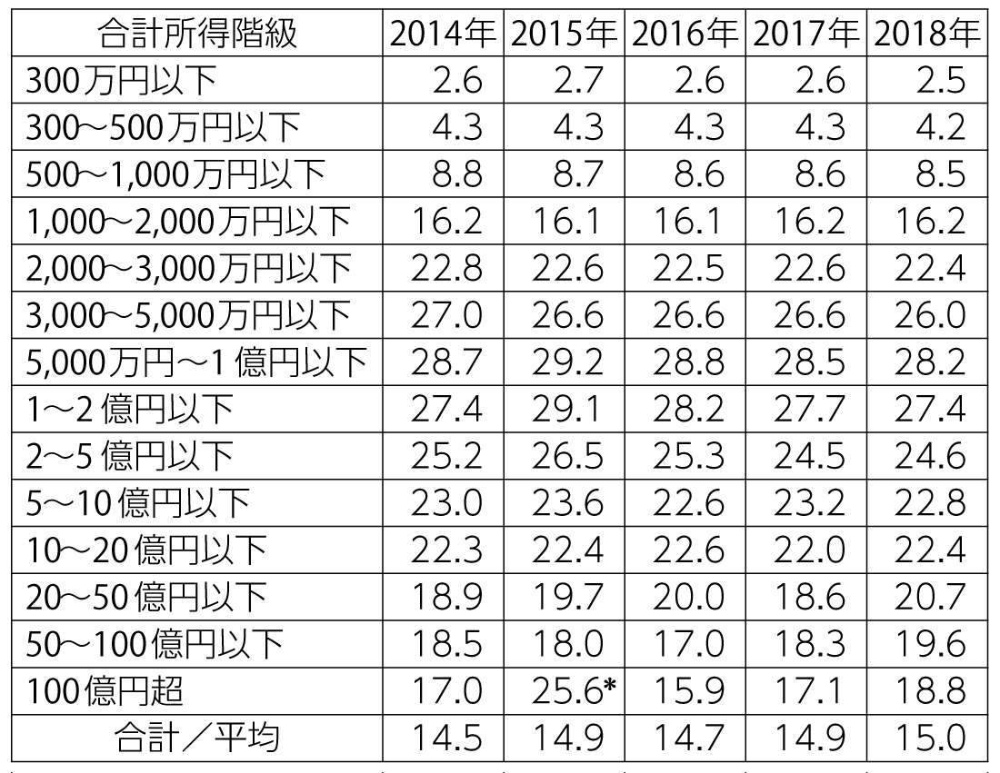 一つは、富裕層の富の大半を占める金融資産は、前記のとおり、金融所得、とりわけ、株式等譲渡所得の低率分離課税という優遇税制の恩恵で形成されたものだという点です。表3は国税庁「申告所得税標本調査」に収録された、合計所得階級別に見た合計所得に対する税負担率(過去5年分)です。これを見ると、合計所得が1億円を超える階級から税負担率が判で押したように低減しています。累進税制でありながら、なぜこういう実態になるのか、原因は表4から明瞭です。合計所得が1億円を超える階級から、合計所得に占める株式等譲渡所得(20%の低率分離課税の適用を受ける所得)の割合が急上昇しているからです。総合課税なら大部分が最高税率45%のブラケット(税率適用所得区分)に入ったはずが、その半分以下の税率で済まされているのです。これがすべての理由とはいわないまでも、高額所得層に偏在した金融所得の優遇によって滅失した所得税収の穴埋めをする形で消費税が増税されてきた現実を考えれば、富裕層が蓄財した富の一部を富裕税で国庫に還元し、社会的規模での再分配の財源に充てることは税の大義に適って余りあります。