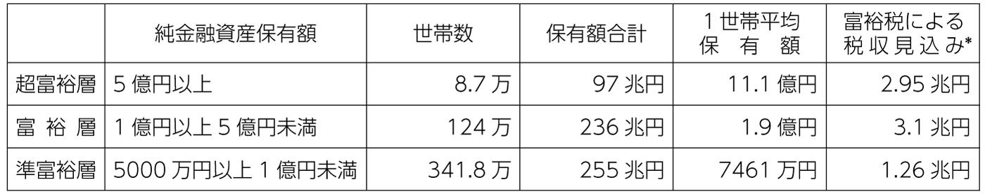 課税対象:固定資産税の対象外の固定資産(一定額以上の絵画・骨董を含む)と純金融資産。ただし、ここでは資料の制約から純金融資産のみ。