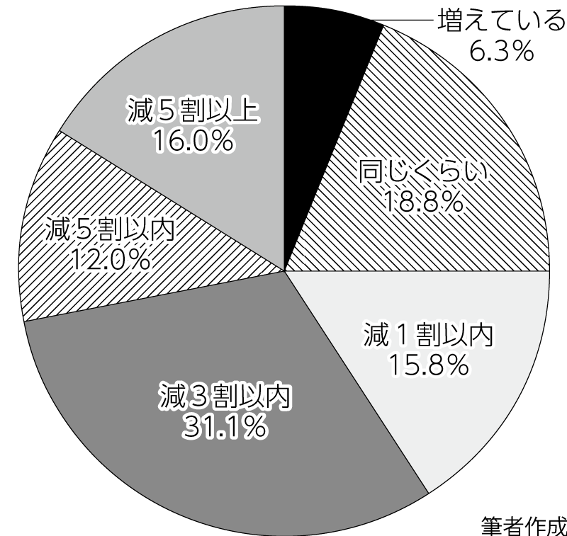 一方で、持続化給付金と家賃支援給付金の給付要件となる「売上減少基準」に該当しない中小商工業者は、そもそも対象から外され、給付を受けることはできませんでした。具体的には(図)、売り上げが「減1割以内」(15・8%)、「減3割以内」(31・1%)、「減5割以内」(12・0%)の事業者は持続化給付金の対象となりませんでした(家賃支援給付金は「減1割以内」、「減3割以内」は対象となりませんでした)。たとえ、売り上げの減少が50%未満であっても、売上減の状況が数カ月間続けば、資金繰りに行き詰まり、事業継続が困難になる可能性は十分にあります。「大手企業系の航空機関連の製造の遅れなどで、3次下請けの弊社への仕事は無くなった。売上減は30%~40%のため持続化給付金は申請できない」(一般機械)、「持続化給付金は売り上げの3割減や4割減も対象にしてもらいたい」(設備工事業)─と、中小商工業者から批判が起こったのは当然でした。