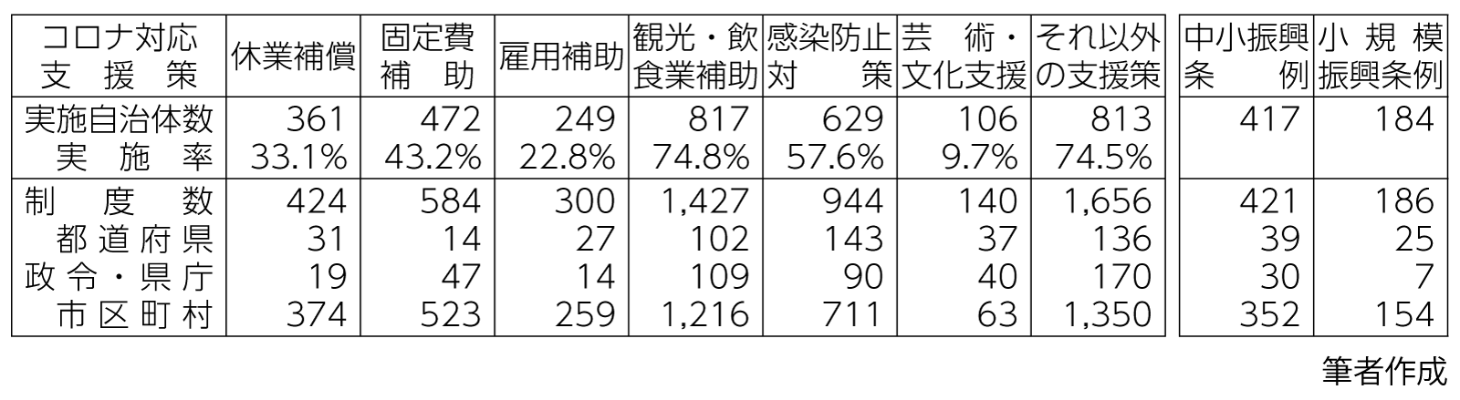 表の通り、①休業補償(実施自治体数361、実施率33・1%、制度数424)、②固定費補助(同472、同43・2%、同584)、③雇用補助(同249、同22・8%、同300)、④観光業等への補助(同817、同74・8%、同1427)、⑤感染防止対策への補助(同629、同57・6%、同944)、⑥芸術・文化への補助(同106、同9・7%、同140)、⑦それ以外の支援策(同813、同74・5%、同1656)です。