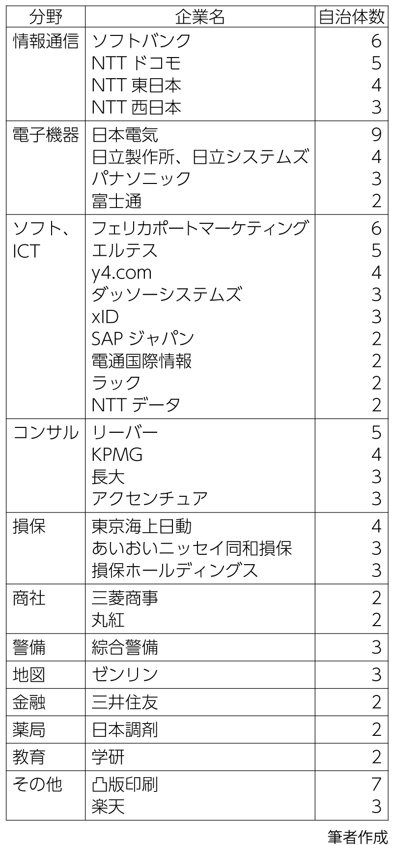 最も多く選定されているのは日本電気で9自治体、次いで凸版印刷が7自治体、ソフトバンク、フェリカポートマーケティングが6自治体になっています。情報通信、電子機器関係の企業が多くなっていますが、損保、商社、警備、金融、教育などの企業も選定されており、生活にかかわるさまざまな企業がスーパーシティに殺到しています。