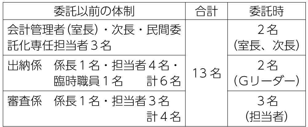 出納室の委託前の職員体制と委託中の職員体制は表2のとおりです。