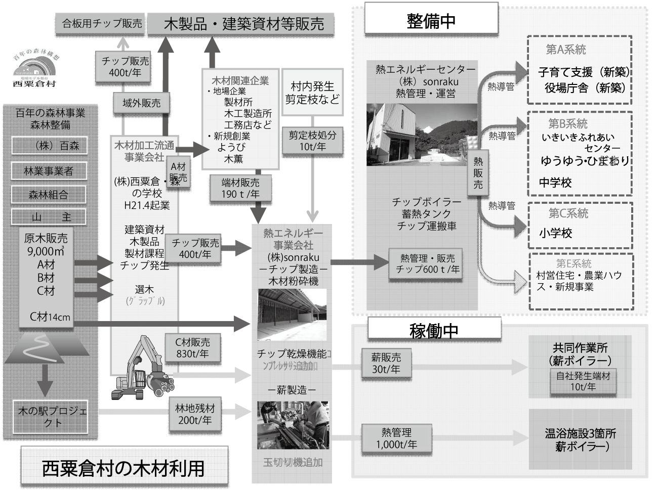 西粟倉村は百年の森林事業で森林を整備しながら、川中で木材加工を行い、建設用に利用できる材木であるA材・B材は木材市場を通すのではなく、森林組合土場から直接販売に変更しました。村内の木材加工会社が材木を地場の製材所、木工加工所、工務店などに販売しました。A材、B材として使えないC材を薪、木質チップなどに加工し、熱エネルギーとして活用し、山で残った間伐材などの林地残材も利用しました。