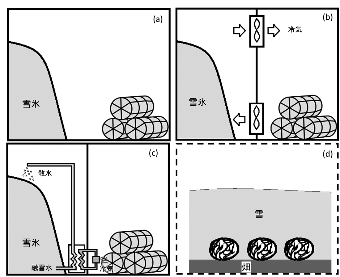 雪室・氷室タイプの(a)よりもさらに簡単な雪氷冷熱の利用は、成長した農作物を収穫せずに降雪を待ち、そのまま貯蔵・熟成させてから収穫する方法(d)です。北海道北部の和寒町の「雪中キャベツ」などがその代表です。建屋もいらず、コスト0で雪冷熱が利用できます。そして、氷温近くで食物を保存すると、熟成されおいしくなることが知られています。ただし、雪が降らず地表面温度が0℃以下になるような寒い地域では、作物が凍結してしまうためこの方法は使えません。
