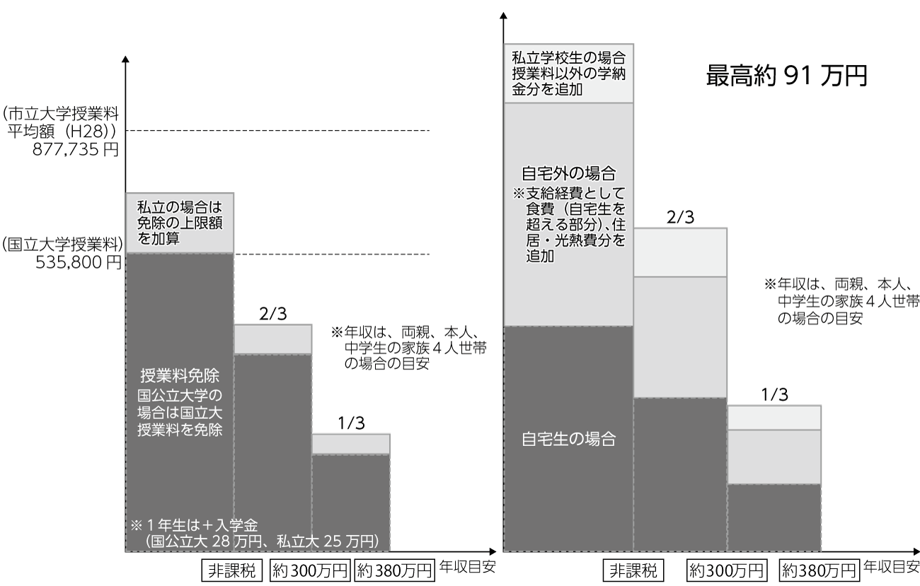 新制度は、消費税増税分を財源として、授業料減免と給付型奨学金を低所得層に対して行うものです。図のように、年収約270万円の住民税非課税世帯(年収額は家族構成によって異なる)の高等教育機関に在学する学生に対して、国公立学校授業料約54万円の全額免除、私立学校授業料については、約70万円の免除をします。給付型奨学金については、私立学校自宅外学生で約91万円を支給します。年収約300万円までの世帯の学生については、その3分の2、年収約380万円までの学生については、その3分の1を支援します。