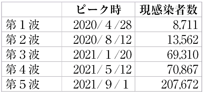「新型コロナウイルス感染症」の「第5波」は、厚生労働省が公表している毎週水曜日時点の「現感染者数」(感染者累計-死亡者数-療養解除者数)によれば、9月1日20万7672人となり、「第4波」のピーク時─7万867人の3倍弱にまで感染爆発し、21都道府県に「緊急事態宣言」、12県に「まん延防止等重点措置」を適用する事態となりました(表1)。