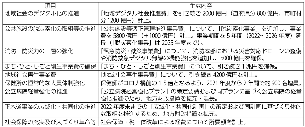 これをまとめたのが表1です。これをみれば、2022年度の地方財政は従来の政策方向との整合性を保ちつつ、デジタル化やグリーン化が強化されていることがわかります。また、地方創生の名目の下に一般財源(「まち・ひと・しごと創生事業費」「地域社会再生事業費」)も確保されており、「骨太方針2021」とも整合しています。その一方では、公共施設等の再編・統廃合の流れ(「公共施設等適正管理推進事業費」「(下水道)広域化・共同化計画」)は変わらず、それどころか事業期間が大幅に延長されています。