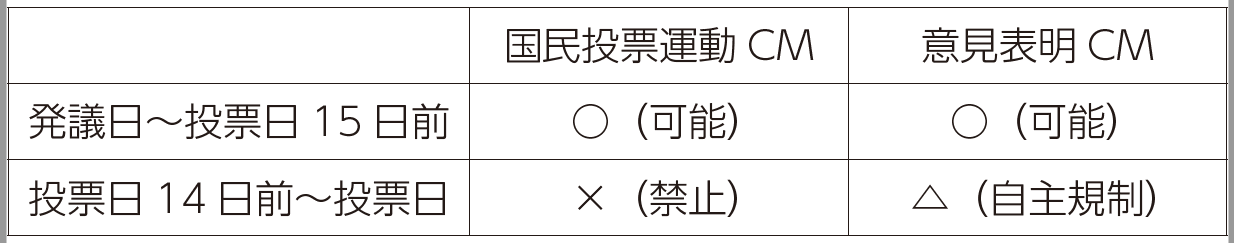 次に、⒝CM規制に関しては、現行法上、⑫投票日14日前から当日までの国民投票運動CMが禁止され、あわせて同じ期間、民間放送連盟のCM考査ガイドライン(2019年3月20日公表)によって、賛成・反対の投票の呼びかけを要素としない意見表明CMを取り扱わないことを「推奨」するとし、自主規制が及ぼされています(表1)。