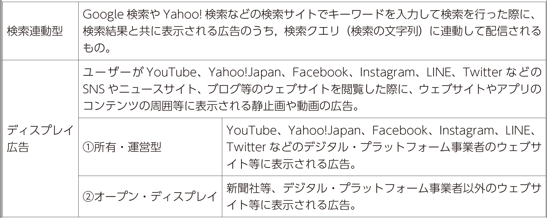 現行法に規定のない⒝デジタル広告は、検索連動型とディスプレイ広告に整理できます(表2)。