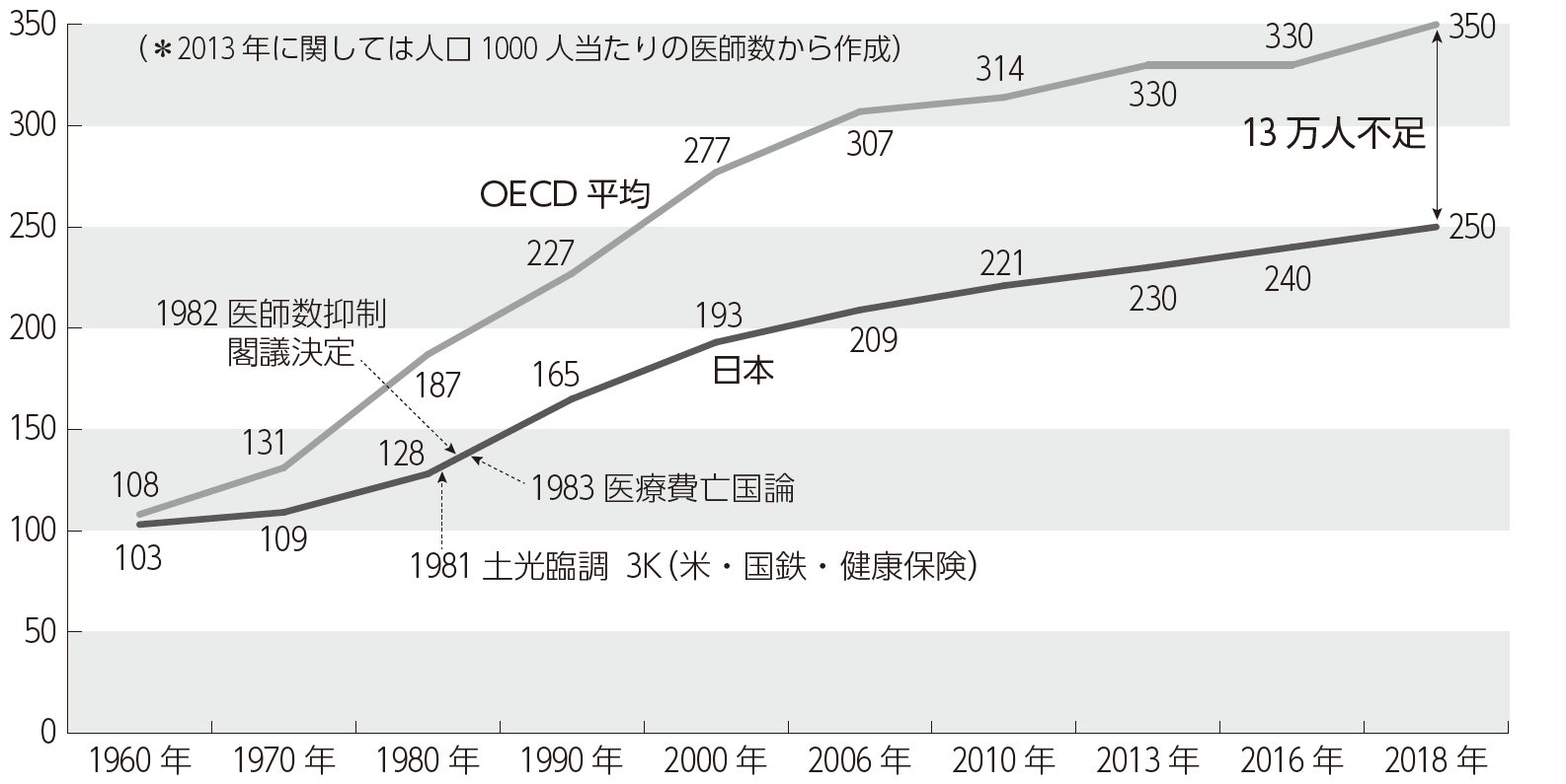 日本は無医村解消を目指して、「人口10万対150人」の医師養成を達成するために、1973年までに全国に一県一医科大学を設置しました。しかし1983年に厚生省の吉村仁保険局長(当時)は、医師養成の目標は達成したとして、医師過剰時代の到来を喧伝し、「医療費亡国論」を唱えたのです(「医療費をめぐる情勢と対応に関する私の考え方」『社会保険旬報』1983年3月11日)。