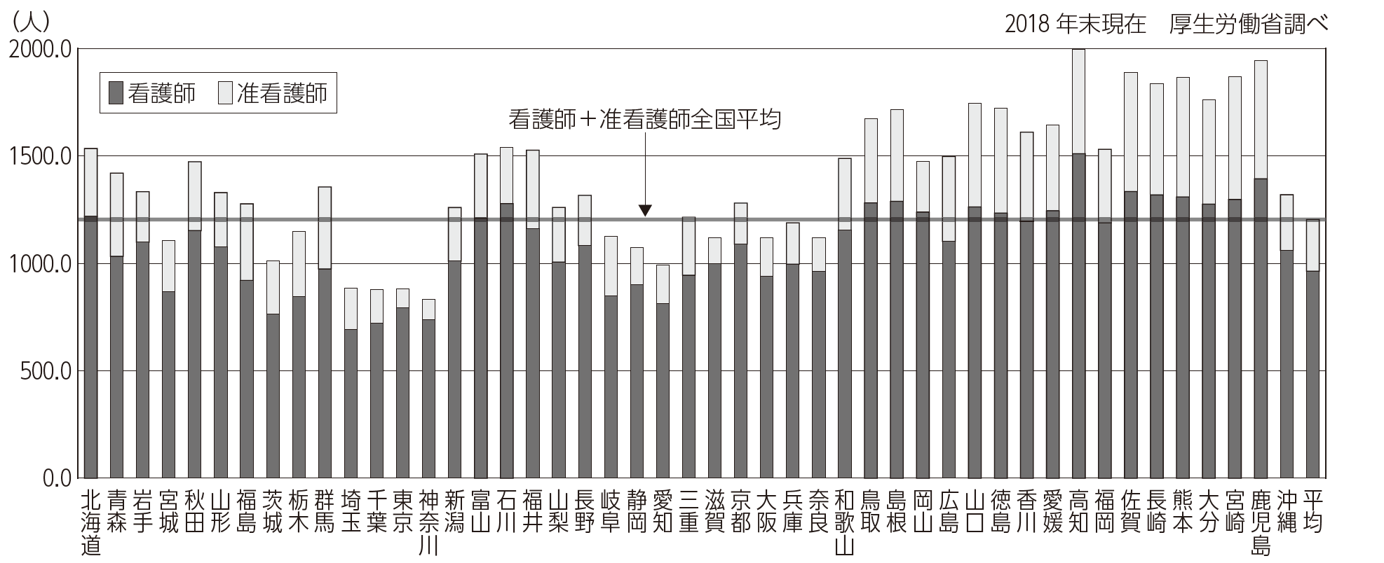 図4 都道府県別就業看護師、准看護師数(人口10万人対)