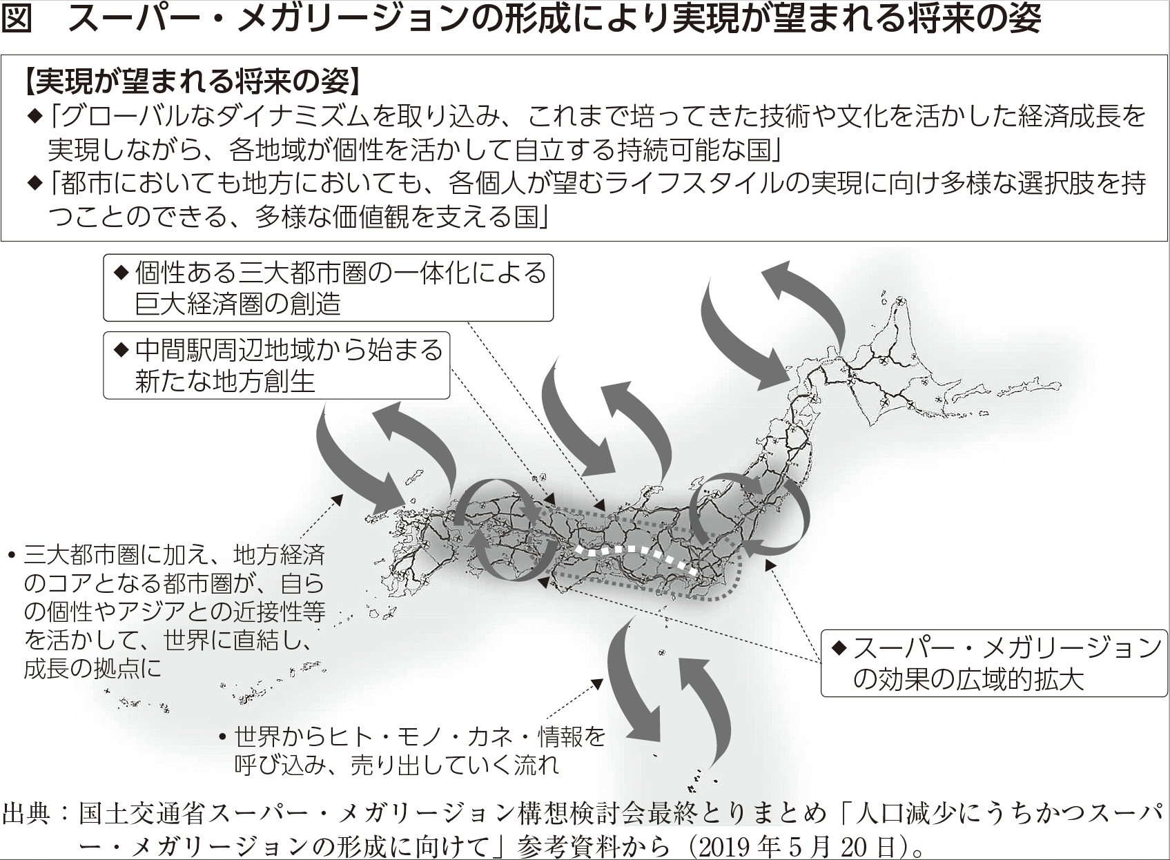 国土交通省は2014年3月に「国土のグランドデザイン2050」を発表しました。そこでは「リニア中央新幹線が三大都市圏を結び、スーパー・メガリージョンを構築」し、国土構造に変革をもたらすと書かれました。リニア中央新幹線は、東京─大阪を67分で結ぶため、東京─大阪の移動は、都市内移動に近いものになるとしています。この東京、名古屋、大阪の三大都市圏が一体化され、一つの大都市のようになったものをスーパー・メガリージョンと呼んでいます。