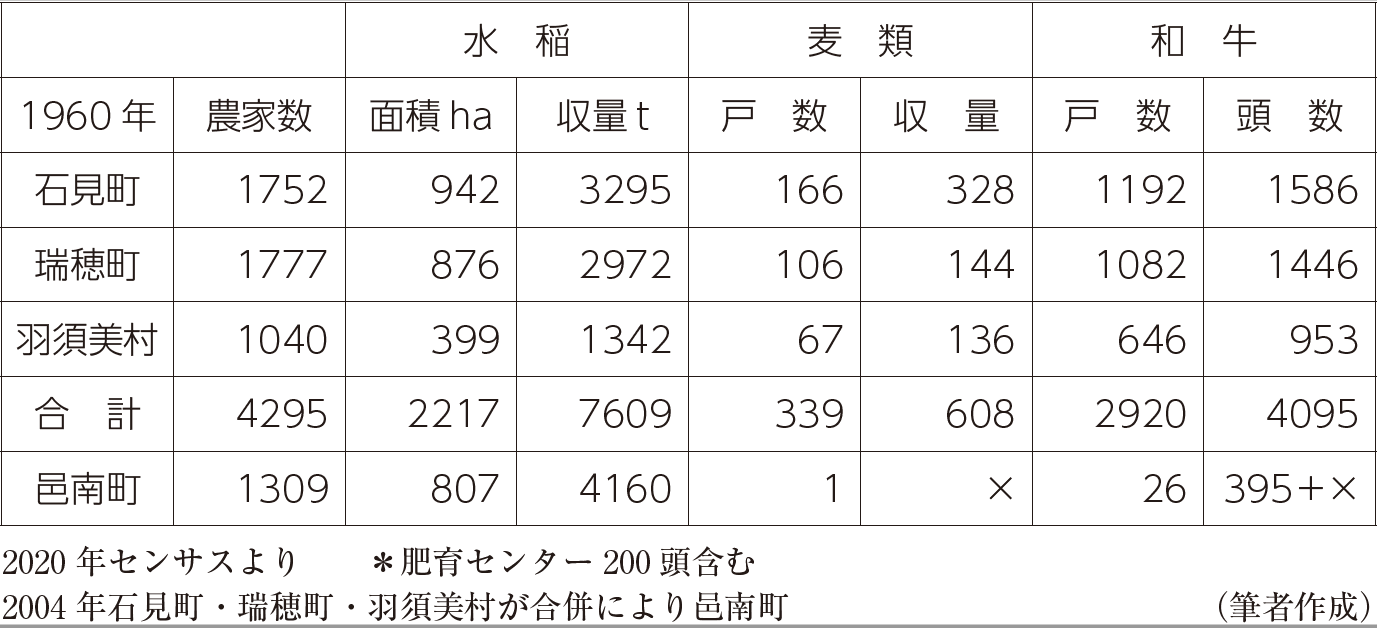 私の住む邑南町は農業基本法が始まる前の1960年と比べ、機械化や過疎化、高齢化による離農で農家数そのものが減るのはやむを得ないとしても、生産基盤である耕地が3020ヘクタールから1327ヘクタールへ6割も減少し、水稲の作付けや牛の飼育頭数減、莫大な農地の荒廃と畜産の激減、麦作の消滅に直面しています(表)。