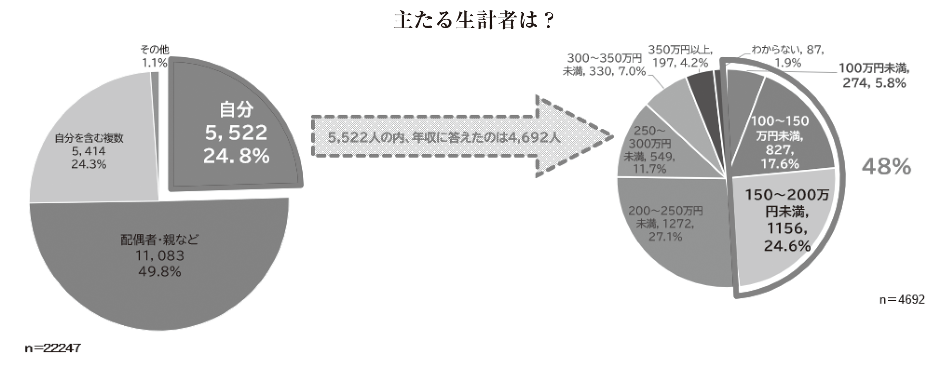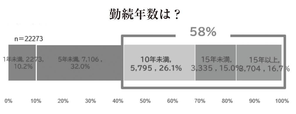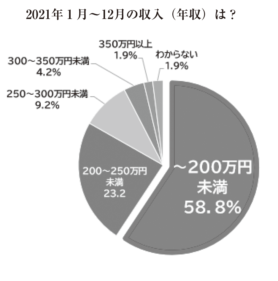 そのうえ、回答者の6割が年収200万円未満と回答しています。重ね合わせてみると、経験が給料に全く反映されない制度的欠陥が浮かびあがります。
