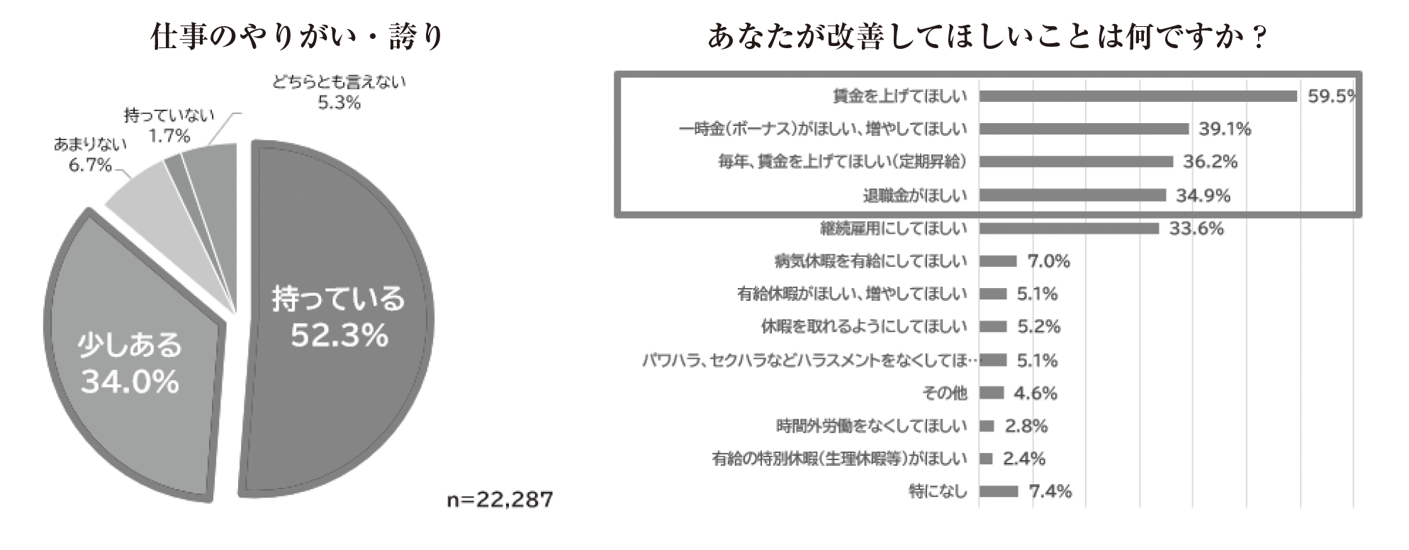 約9割の人が、住民と日々接する仕事にやりがいと誇りを感じながら働いていると回答しています。その一方で、改善を求める項目の1位から4位までを、賃金を上げてほしい、一時金、経験の反映、退職金がしめました。物価高騰がすすみ生活が苦しくなる中、まさに行政による「やりがい搾取」ともいえる状況が浮き彫りとなっています。