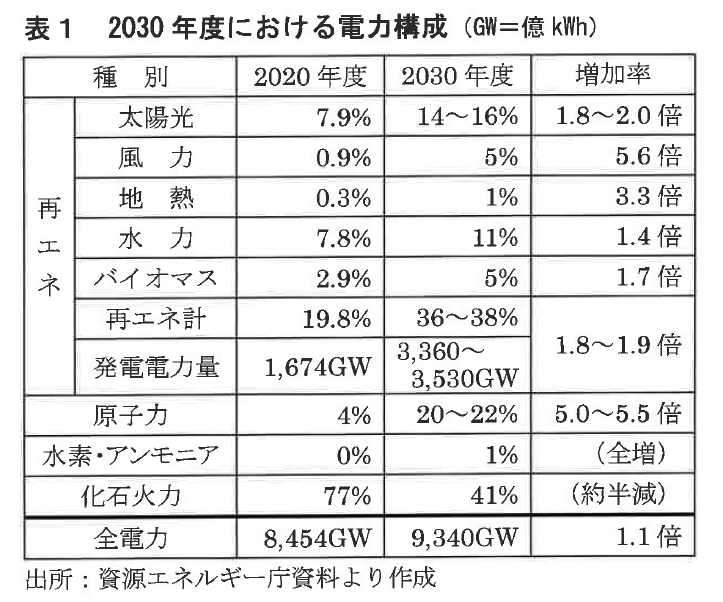 つまり、2030年に向けて、再生可能エネルギーは現状の倍化が目標となっています。種別にみると(表1)、風力発電が5・6倍化、地熱発電が3・3倍化となっており、今後風力発電と地熱発電の開発に政策的な力点が置かれていくことがうかがえます。