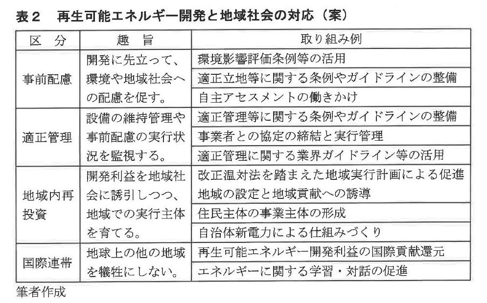 再生可能エネルギー開発を適正に進めていくためには、地域社会の側に、次の3本柱により対応していく必要があります(表2)。
