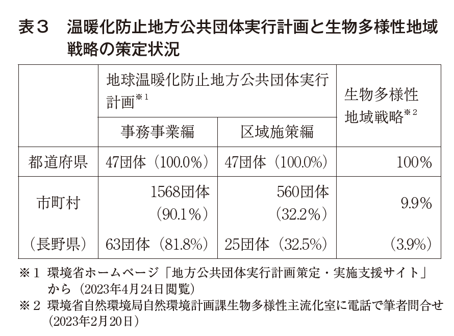 一方、市町村の取り組み状況をみると、温暖化防止実行計画(区域施策編)を策定しているのは560団体32・2%(2023年3月末現在)、生物多様性地域戦略の策定は152団体8・5%(2023年1月末現在)となっています(表3)。様々な計画の策定が政府から押し付けられている市町村の実情からすると、温暖化防止や生物多様性保全は優先度の低い課題かもしれません。
