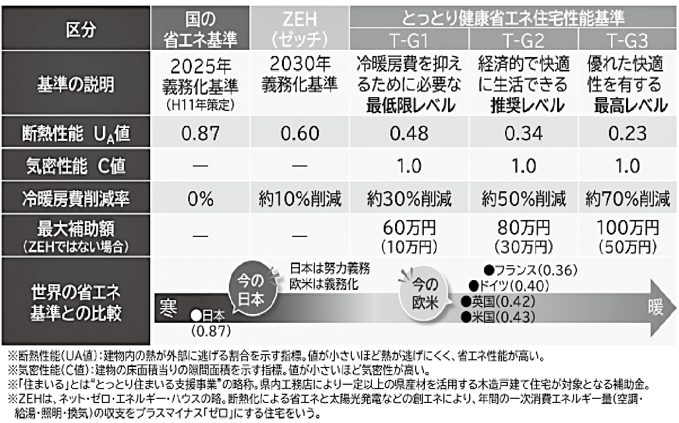 日本でも、断熱対策を促進する動きが自治体でみられます。政府は、建築物の省エネ基準を引き上げて、ゼロエネルギー住宅(ZEH)やゼロエネルギービル(ZEB)の普及を目指していますが、海外の基準と比較すると見劣りします。それに対して、鳥取県の独自の省エネ・断熱基準は諸外国のトップレベルを上回ります。