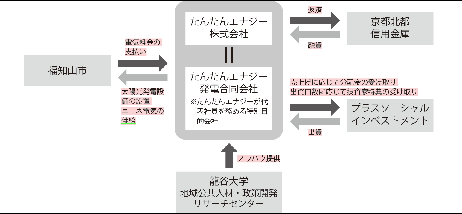 日本では、シュタットベルケをモデルとした「地域新電力」が74社存在し、自治体が出資または協定締結しています。京都府福知山市のたんたんエナジー株式会社は、注目される地域新電力の一つです。福知山市、京都北都信用金庫、たんたんエナジー株式会社などの5者が協定を締結し、2021年度から「市民参加型オンサイトPPA 事業」を始めました(図2)。