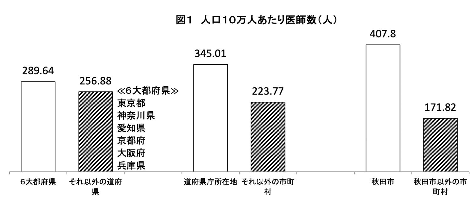人口10万人あたりの医師数は、道府県庁所在地(東京を除く全国)の345人に対して、それ以外は224人(2020年)。秋田市(408人)の場合、それ以外(172人)の2・4倍です。秋田県に限らず、各数値は、医師が「人口がより多い地域」により多く、「人口がより少ない地域」により少ない傾向にあることを示しています。