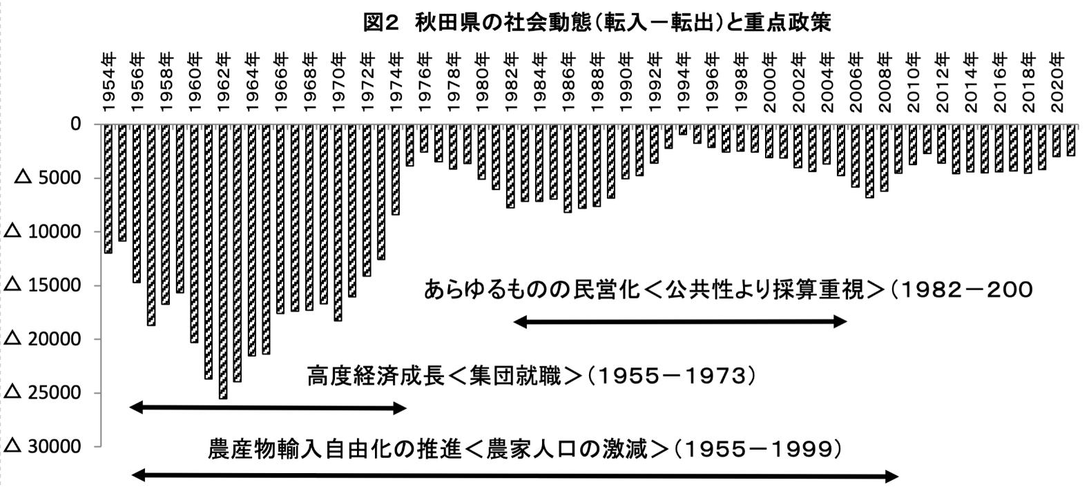 医療機関の経営が困難な「人口の少ない地域」、つまり「地方」は、どうして人口が減ったのか、それが二つ目のポイントです。特に大きな影響を受けたのが「農産物輸入自由化」で、1950年を境に農家人口が激減しました。同時に「地方の労働力」を「集団就職」などの形で都会に運び、「高度経済成長」が果たされました。80年代には通信・専売・郵政・交通など、あらゆるものが「民営化」され、「採算が合わない地域」は切り捨てられていきました。地方の人口は、「自然現象」や「個人的な志向」などではなく、政策的に「減らされた」ことは明らかです。