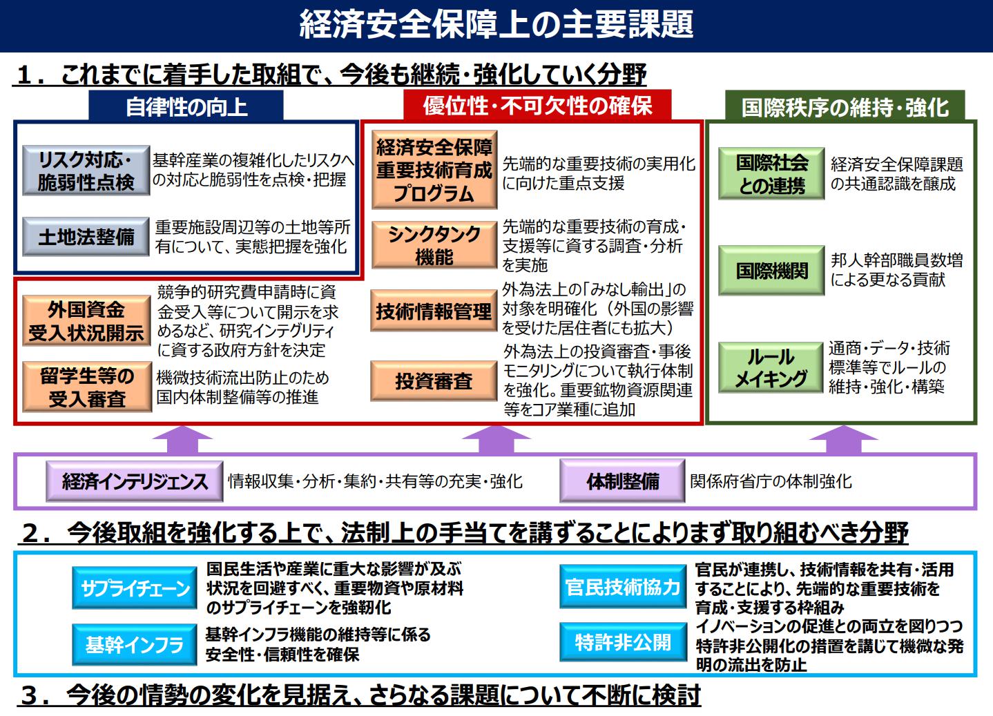 岸田政権は前述の「経済安全保障法制に関する有識者会議」と「経済安全保障推進会議」の提言を受けて、2022年春の通常国会で、経済安全保障推進法を成立させました。