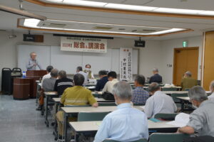 市勤労者総合センターで開催された総会には26名の会員が参加。大泉理事長の挨拶の後、石田文雄理事(海南市)を議長に選出し審議を進めました。昨年度の取り組みでは、田辺市の合併検証と龍神村でのシンポジウム開催が報告され、今年の取り組みでは、組織強化・会員拡大に力を入れると提案されました。また、「住民と自治誌」の値上げに伴い、10月から会費と賛助会費を月額200円と100円の値上げ(月額1,200円、400円)が承認されました。質疑では議長の指名で4名の発言があり、インボイス反対運動の現状、自衛隊への名簿提供問題、「月報」改善に読者の声を届けてほしいとの要望などが出されました。